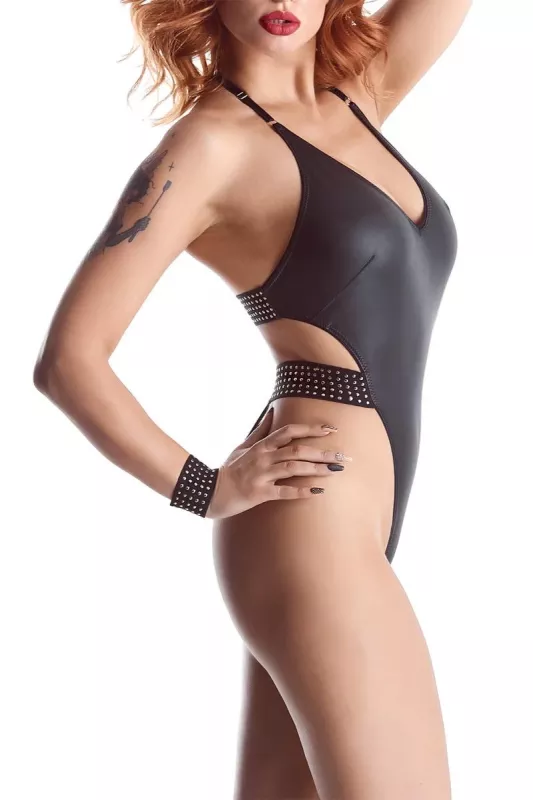 Body der die Silhouette perfekt formt. Ganz aus schwarzem, federndem Wetlook-Stoff, wodurch er sich perfekt an den Körper anschmiegt und seine Vorzüge betont. Hoch profilierte Seiten verlängern die Beine optisch und verschlanken die Silhouette. Auf der Vorderseite gibt es ein auffälliges Dekolleté, und auf der Rückseite hebt sich der mit schwarzem Stoff sinnliche Po und der nackte Rücken hervor. Ergänzt wird der ganze auffällige Look durch dekorative Elemente: Goldapplikationen am Gummizug in der Taille und am Rücken und strapazierfähige goldfarbene Metallringe. Das Model auf dem Foto ist 176 cm groß und das vorgestellte Produkt hat Größe S.